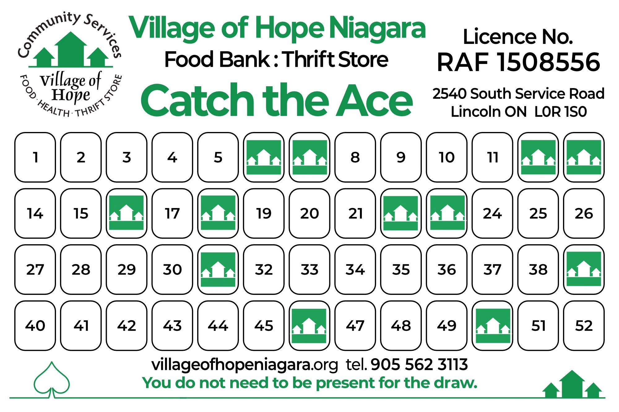 All proceeds support the food bank and programs of Village of Hope Niagara. We welcome groups of friends or colleagues to purchase tickets together for our Catch The Ace progressive raffle.