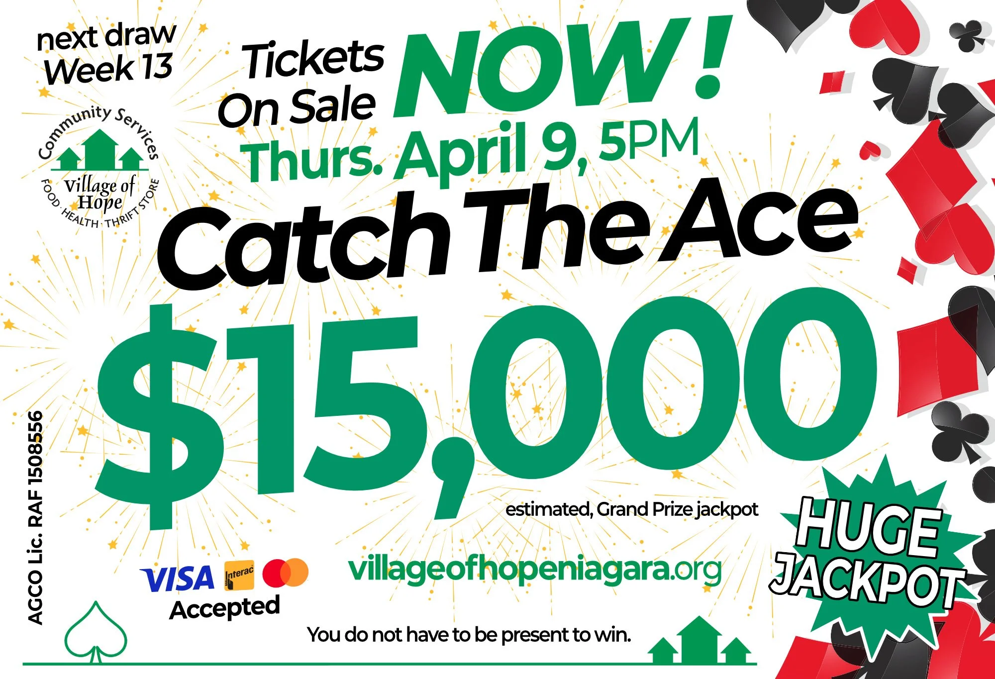 The Grand Prize grows, now expected to exceed $15000. Get your tickets at Village of Hope Niagara! Support Village of Hope Niagara's Catch The Ace Progressive Raffle – our community wins and you might too. Join the fun.