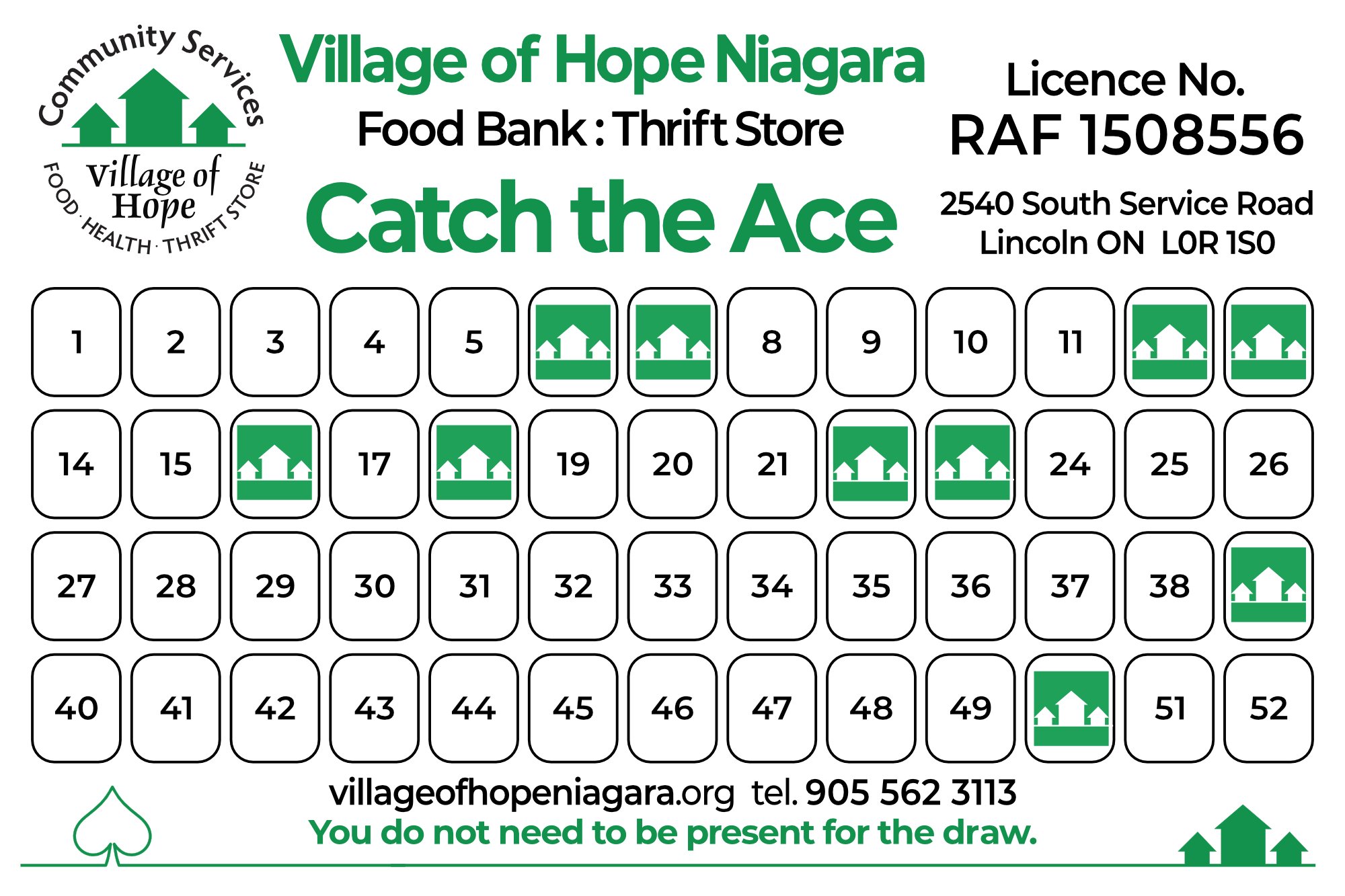 All proceeds support the food bank and programs of Village of Hope Niagara. We welcome groups of friends or colleagues to purchase tickets together for our Catch The Ace progressive raffle.