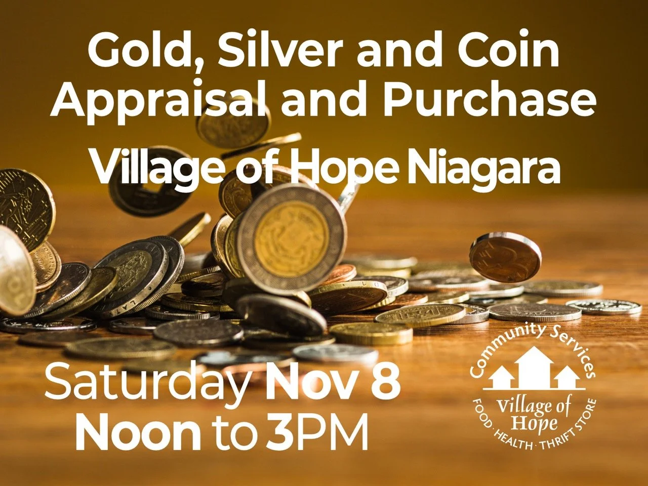 #SaveTheDate We've got a Special Event for you in our Treasure Aisles on Saturday, Nov 8 from Noon to 3:00p.m. Village of Hope Niagara Thrift Store is hosting a Coin appraiser who will assess and purchase your coin/currency collections or accumulations, and will also evaluate and purchase any gold, or silver on-site. No appointment is necessary. A donation of $10 for up to 5 items is requested. All proceeds support our Food Bank and the programs of Village of Hope Niagara.
