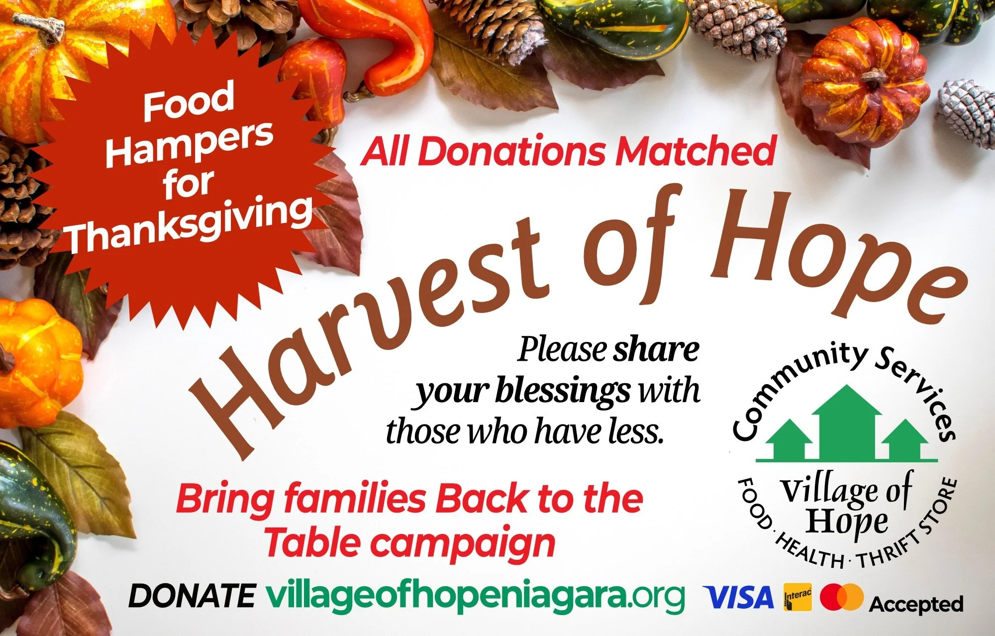 Harvest of Hope is our Annual Thanksgiving time of sharing and caring, for our neighbours in need. During Harvest of Hope, we come together, as a community of compassion, with empathy and generosity, for our neighbours. Our volunteers are making Harvest Hampers for a Thanksgiving of Hope. Through your donations of food and funds to Village of Hope Niagara, your generosity provides food security, programs of support and empowerment, and hope to those who need.